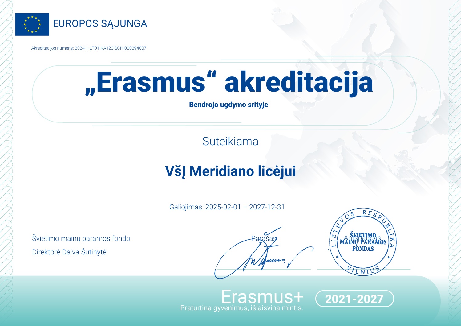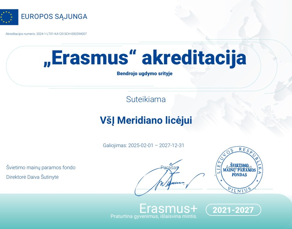 Džiaugiamės galėdami pranešti, kad mūsų licėjui suteikta Erasmus+ akreditacija! Tai reiškia, kad Meridiano licėjaus mokiniai ir mokytojai galės dalyvauti įvairiose tarptautinėse mobilumo veiklose ir išplėsti savo mokymosi horizontus visoje Europoje!