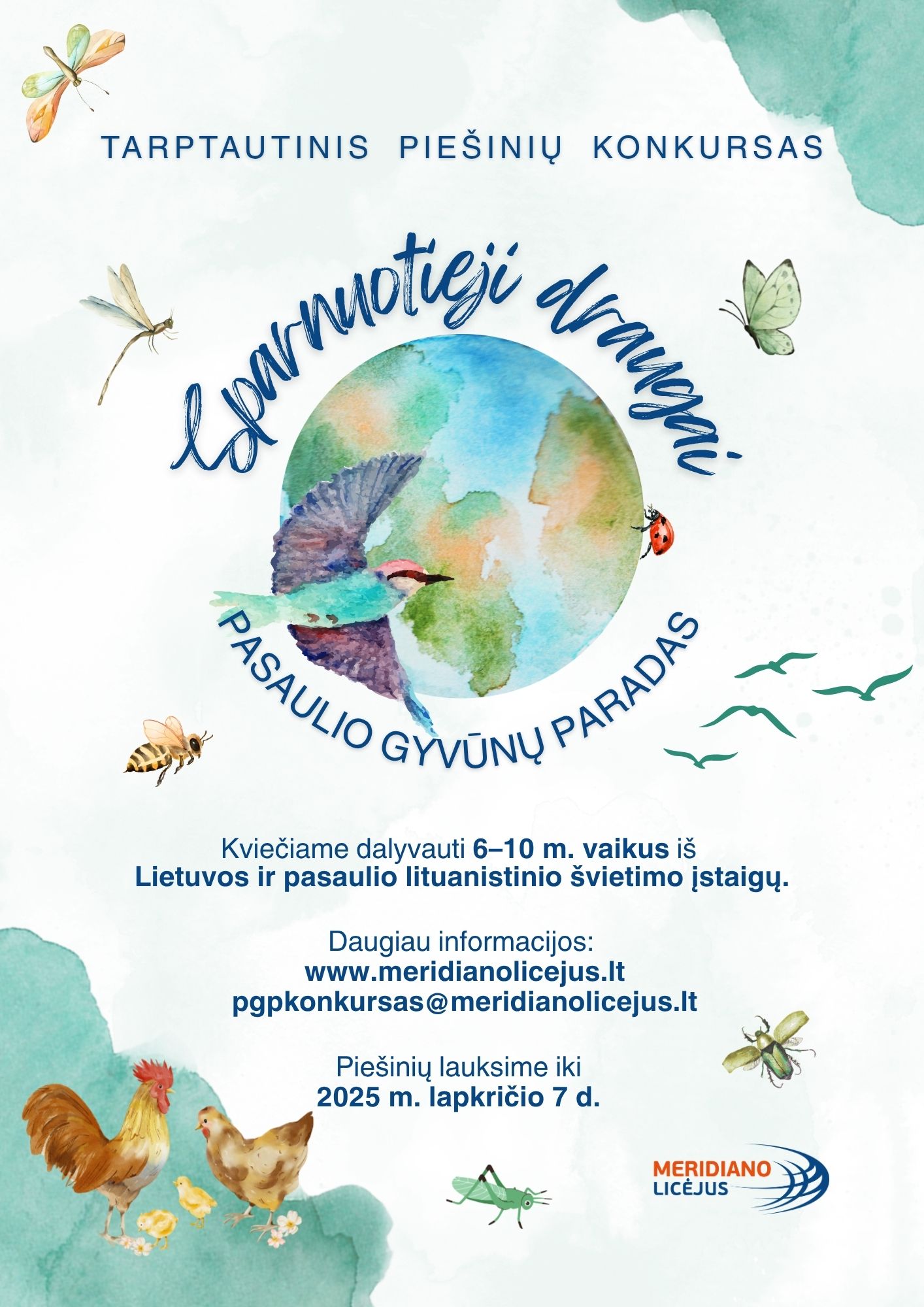 Kviečiame 6–10 metų vaikus iš Lietuvos ir pasaulio lituanistinio švietimo įstaigų dalyvauti Meridiano licėjaus organizuojamame tarptautiniame piešinių konkurse ,,PASAULIO GYVŪNŲ PARADAS. SPARNUOTIEJI DRAUGAI“.
